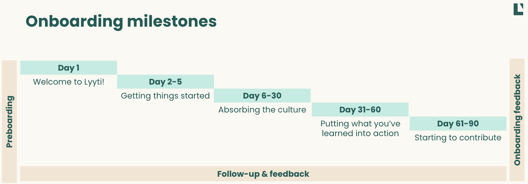 As we see it, the "official" onboarding period lasts 90 days, starting from the new joiner's first day. The target for the first 90 days is to get the new Lyytian going with a solid foundation to succeed in their role and be a part of the Lyyti team.